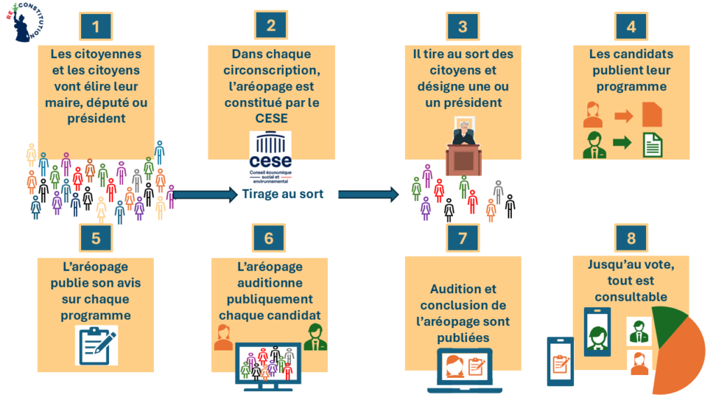 - Aréopage citoyen pour les élections ou la responsabilité politiques des élus. Cette modification fait partie du thème 7, pour la partie « Participation citoyenne ».